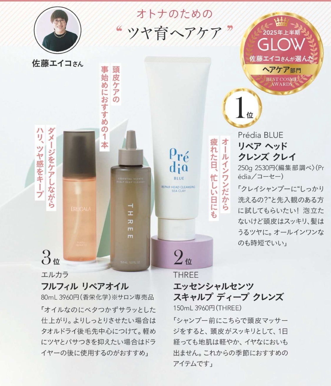 宝島社『GROW』8月号「本気のツヤ活 ベストコスメ2025年上半期美容のプロが選ぶ”個人的”ベストコスメヘアケア部門」でエルカラ フルフィル リペアオイルが3位に選ばれました。